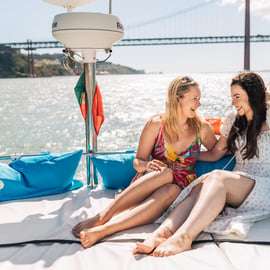 Entspanne dich an Bord unseres Katamarans, während du Lissabon vom Wasser aus betrachtest. Fahre den Tejo entlang und bewundere die wichtigsten Sehenswürdigkeiten wie das Alfama-Viertel, den Handelsplatz und die Christkönigskirche. Nimm einen Drink von der Bar an Bord, während du den Sonnenuntergang über Lissabon und dem Wasser beobachtest.