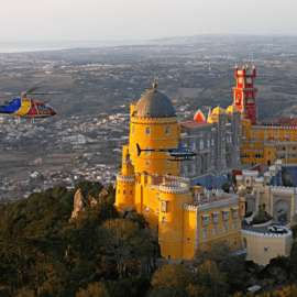 Beim Überfliegen dieser UNESCO-Welterbestätte wirst du auch den prächtigen Pena-Palast mit seinen leuchtenden Farben und den großen Queluz-Palast sehen, der oft mit Versailles verglichen wird.