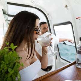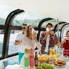 Genieße eine lebendige und dennoch elegante Kreuzfahrt an Bord unseres luxuriösen und äußerst komfortablen Bootes, das für Entspannung, gesellige Momente und unvergessliche Ausblicke konzipiert ist. Dieses Premium-Erlebnis bietet eine offene Bar mit unbegrenztem Vinho Verde Casal Garcia Weiß und Rosé, weißer Sangria, Porto Tonic, portugiesischem Bier, Erfrischungsgetränken, Mineralwasser und Kaffee, gepaart mit einem portugiesischen Verkostungsbuffet mit Pão de Queijo, gerösteten Erdnüssen, frischen Trauben und dem legendären Pastel de Nata, alles in einer lebhaften und einladenden Atmosphäre an Bord.