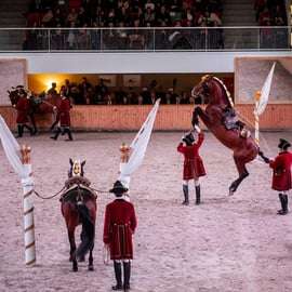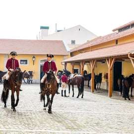 Als Nächstes folgst du dem Lehrpfad im Nora Pateo, wo du einen Einblick in die Geschichte und die Techniken der portugiesischen Reitkunst erhältst. Der Höhepunkt deines Besuchs ist die Teilnahme an einem Training oder einer Vorstellung in der Henrique Calado Arena. Hier führen Reiter und Pferde choreografierte Routinen zu Musik vor, die das Ambiente des portugiesischen Hofes nachempfinden. Die Bühnenbeleuchtung der Arena unterstreicht das Erlebnis und macht es zu einer wahren Zeitreise.