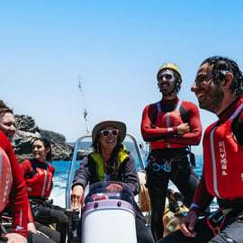 Starte mit einer Abholung in Lissabon oder triff deine Guides in Porto de Abrigo in Sesimbra. Rüste dich mit deiner gesamten Coasteering-Ausrüstung aus, einschließlich Helm, Schwimmweste, Anzug, Abseilgerät und Klettergurt. Du wirst jederzeit von professionellen und erfahrenen Guides begleitet.