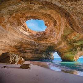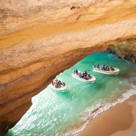 Als Nächstes kannst du in die außergewöhnliche Benagil-Höhle eintauchen. Das Betreten der Höhle ist zwar nicht mehr möglich, aber bei gutem Seegang kannst du gegen Aufpreis eine Bootsfahrt machen. Von einem atemberaubenden Aussichtspunkt aus kannst du die kolossale Meereshöhle bewundern, die für ihr natürliches Oberlicht bekannt ist, durch das Licht strömt.