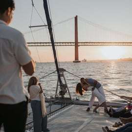Ga mee op een catamaran bij zonsondergang op de rivier de Taag. Geniet van een drankje aan boord, ontspan op de netten van de boot en vaar langs beroemde plekken zoals de Belém-toren en de 25 aprilbrug.