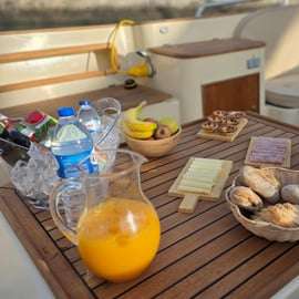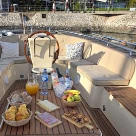 Aan boord geniet je van zachte stoelen, dekens voor koelere momenten, wifi en een eigen toilet — comfortdetails die echt het verschil maken op het water. Bij elk vertrek is een volledige open bar inbegrepen (witte wijn, rosé, bier, frisdrank en water).