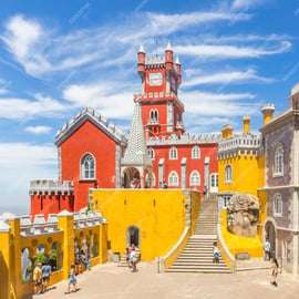 Op de hoogten van Sintra bezoek je het majestueuze Pena-paleis. Het is een van de mooiste paleizen ter wereld en is gemakkelijk te herkennen dankzij de felle kleuren.
