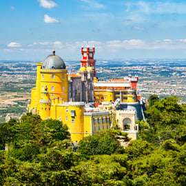 Terugkerend naar het centrum van Sintra fietst u bergafwaarts en werpt u een laatste blik op het Pena-paleis, een belangrijk monument van de Portugese Romantiek.