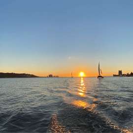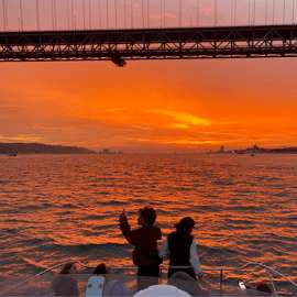 Sätt segel på en fantastisk båttur i solnedgången längs den magnifika floden Tagus. Njut av en fantastisk utsikt över den majestätiska staden Lissabon från vattnet ombord på en privat katamaran med en bar och guide ombord.