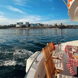 Koppla av ombord på vår katamaran medan du tar in Lissabon från vattnet. Segla längs floden Tagus och beundra viktiga attraktioner, inklusive Alfama-kvarteret, Commerce Square och Christ the King. Smutta på en drink från baren ombord medan du tittar på solnedgången över Lissabon och vattnet.