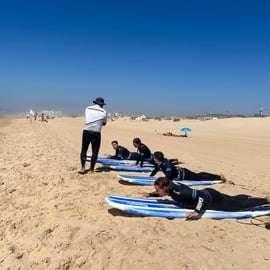 Lär dig surfa på Costa de Caparica nära Lissabon. Välj kvalitet, säkerhet och massor av kul med en surflektion från en skola (SurfChamp SurfSchool) med över 13 års erfarenhet. Njut av en säker, avkopplande och spännande upplevelse med en liten grupp.